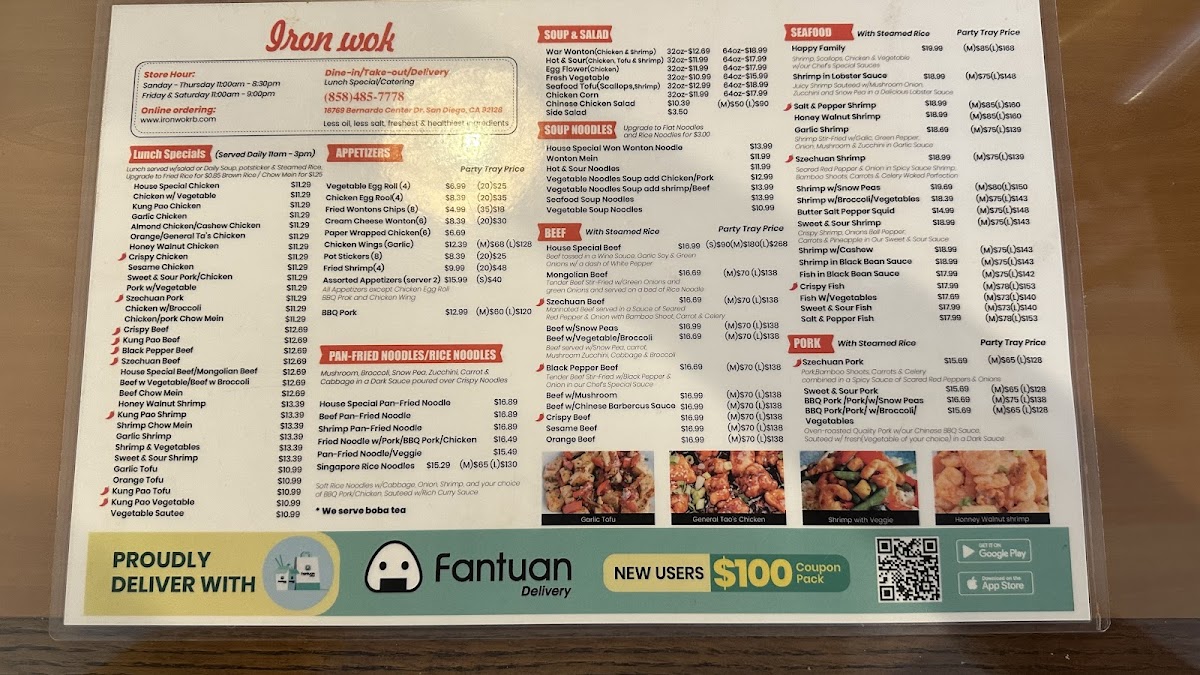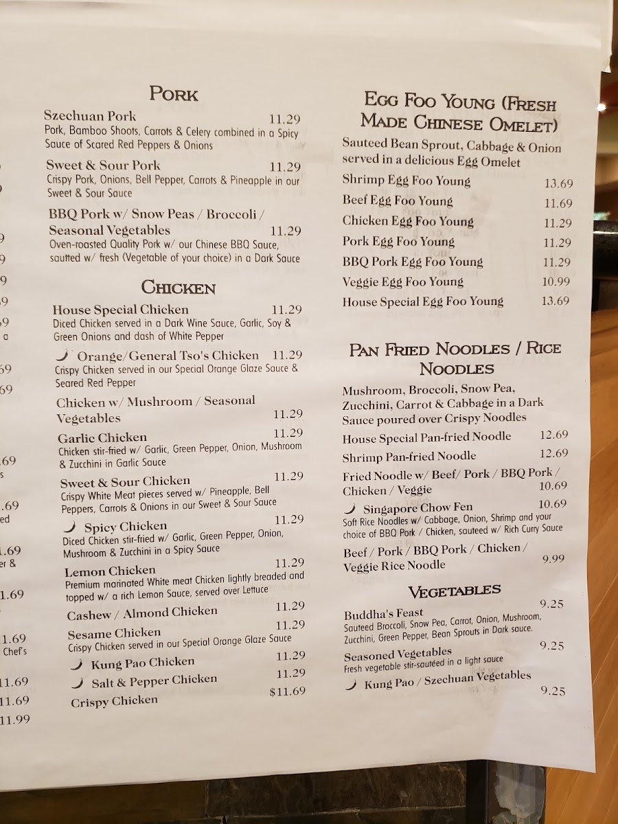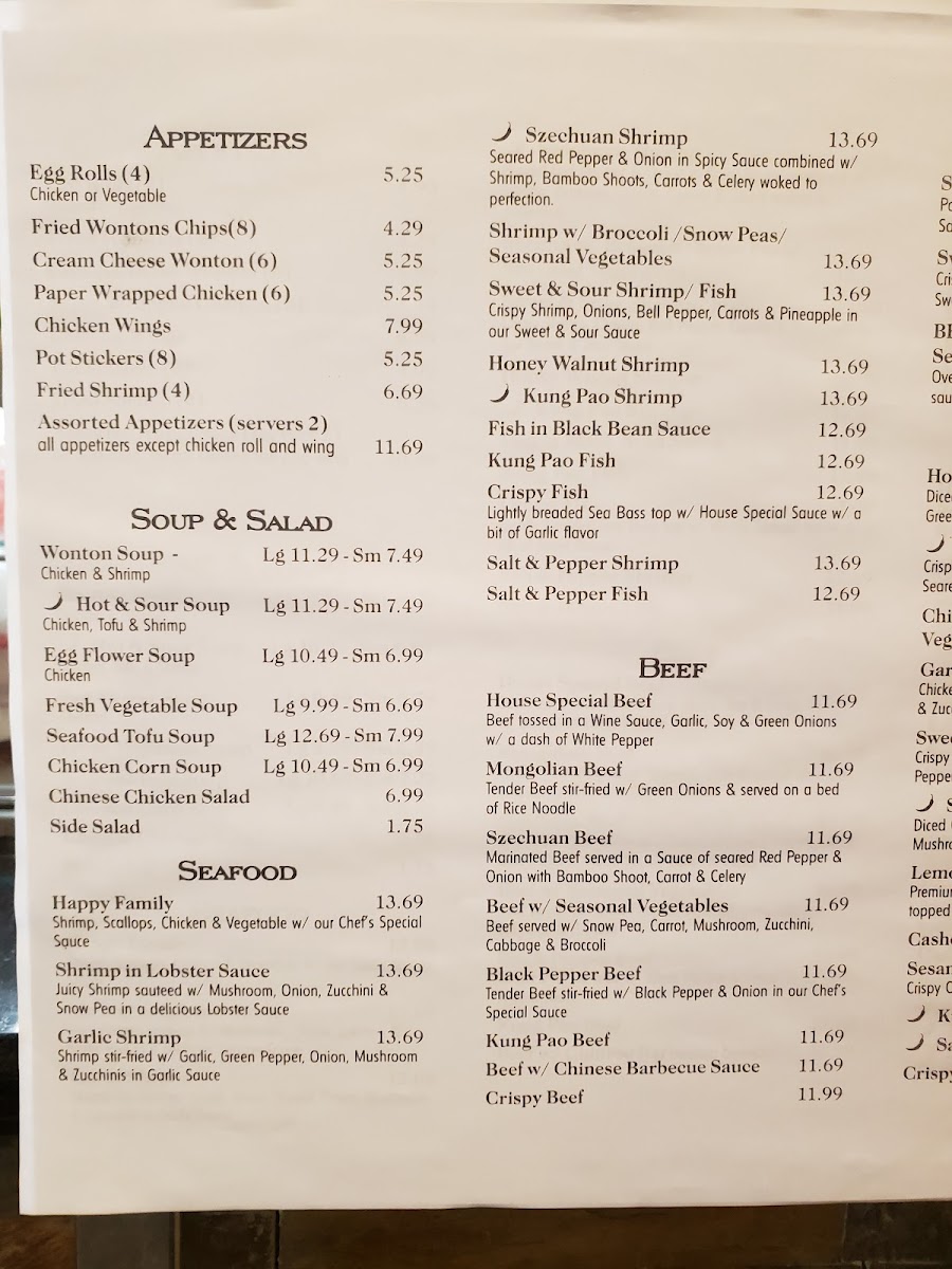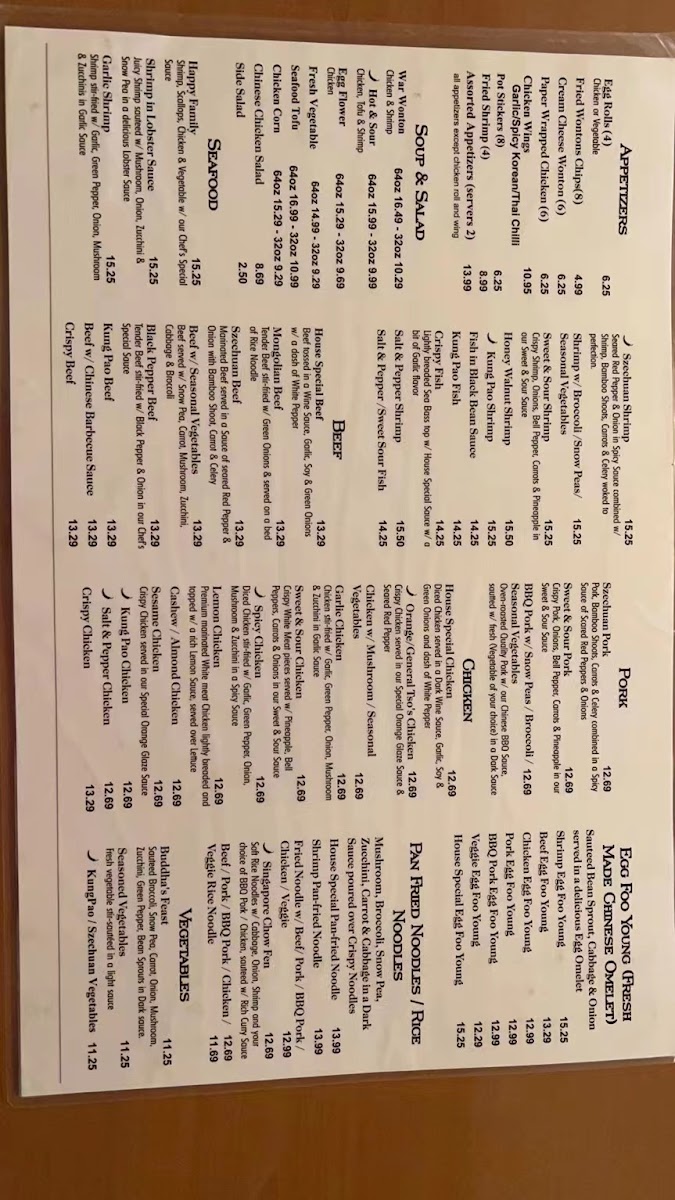 Includes beef chicken and shrimp. Seared dried chilies until blackened with the addition of golden peanuts, green onions, and water chestnuts.
